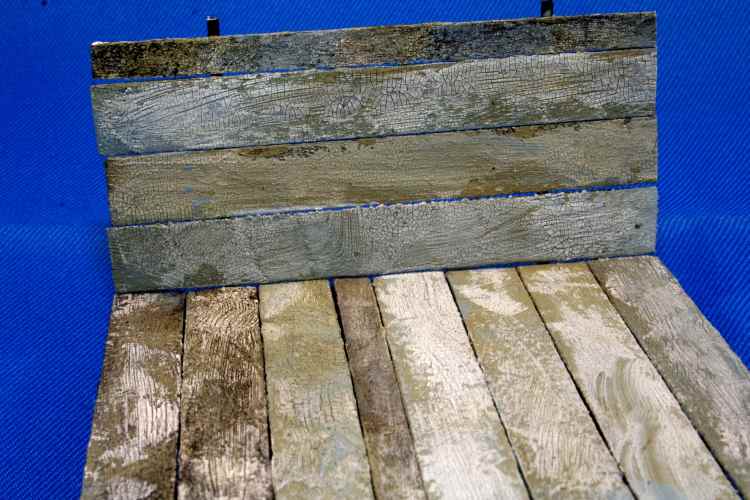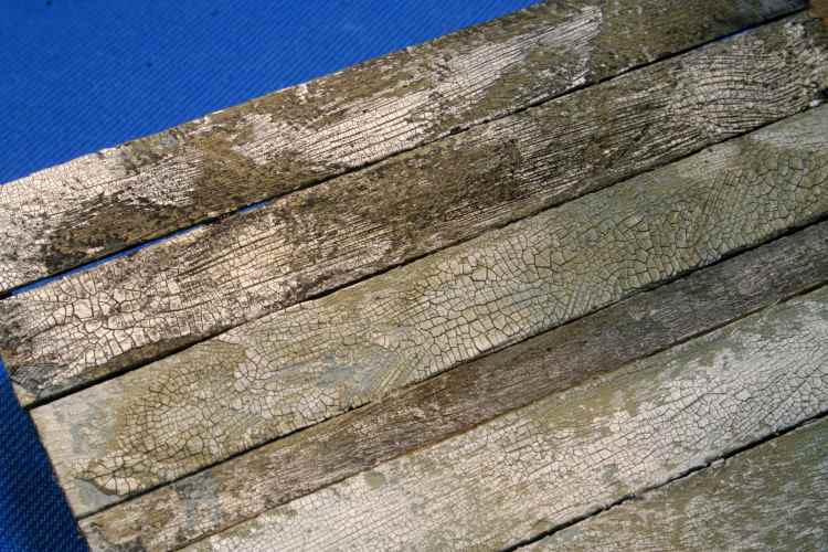 On this project I tried the first time Distress Crackle Paint to get a different look on weathered wood. I first sprayed the wood strips with black ink and then I applied several coats of Weather Wood , Picket Fence, Old Paper and Frayed Burlap.  To get  a deeper apperance of the cracks I used black ink, which wasn't that what I want.  You can see this on the two far left wood strips and the two  smaller stripes. Therefore I used The Detailer Black to get a  different look. This was used on all other wood strips.