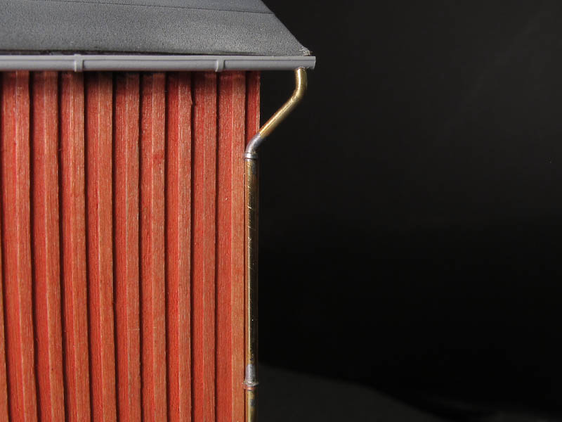 The etches are already bent when you buy them, but they need to be straightened a bit. I insert  a 1mm diameter pianowire into the gutter, and use a pair of pliers with broad, smooth jaws to press the gutter snugly against the wire. The gutters are painted with Tamiya grey fine surface primer. Then a dark brown wash from Mig products. I finish with some pigment powder. Nothing fancy, in other words!