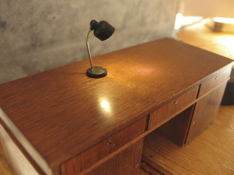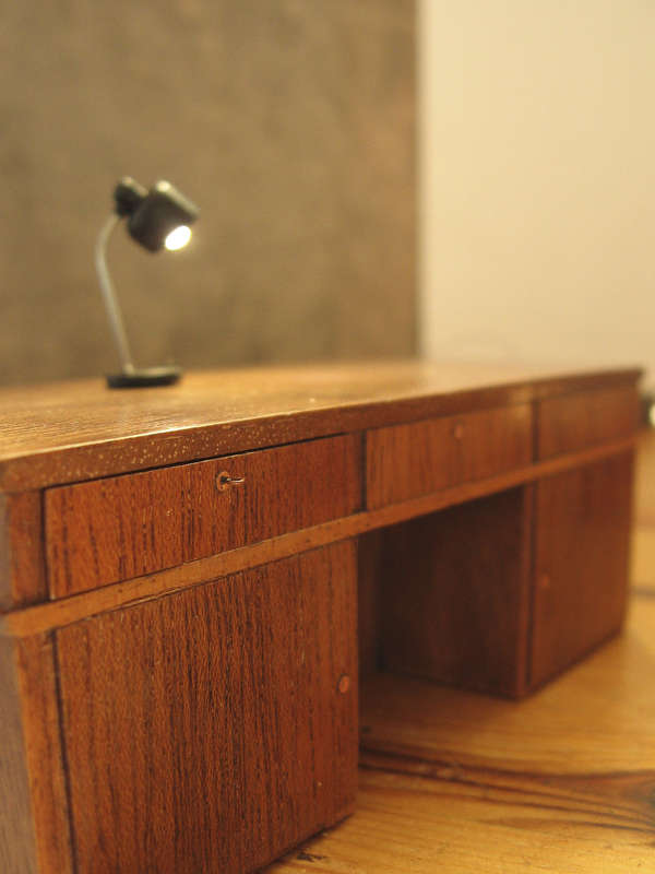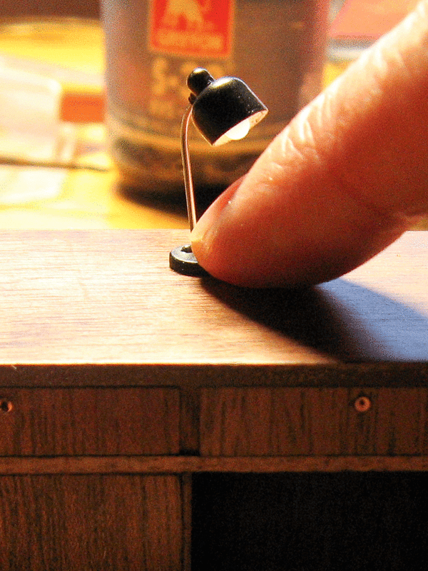 Anyway - I need this desk for testing the lamp switch. And I like the rosewoodish impression of my veneer and so I tried on to improve it at least a bit. First attempt was using a wood filler. This worked well, but as Russ mentioned it brings a somewhat artificial coloring to the wood. When I then started applying thinned nail enamel all the filler came off ... Reset. There was nothing to loose, so some CA had to serve as filler. That worked well and after sanding it down, applying mat lacqquer and polishing it with shoe polish it's a bit better. I think Marty meant the grain of the desktop front; this should be running parallel to the desktop (I glued two layers of veneer at right angles). No, this is no great result, but CA again has proven as a good home remedy.