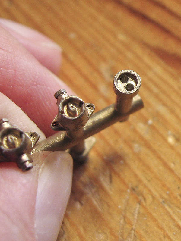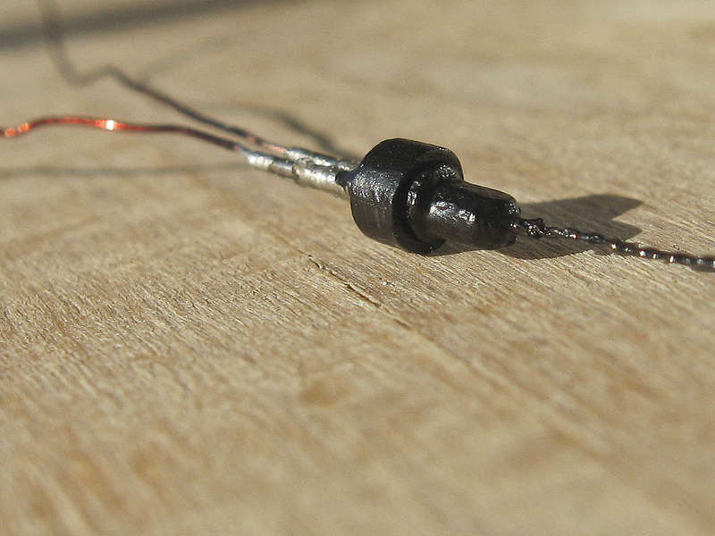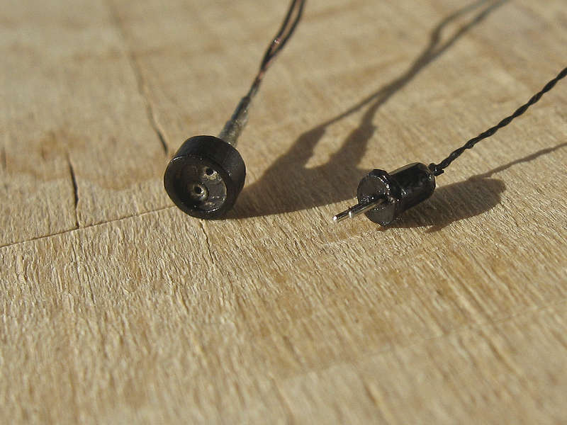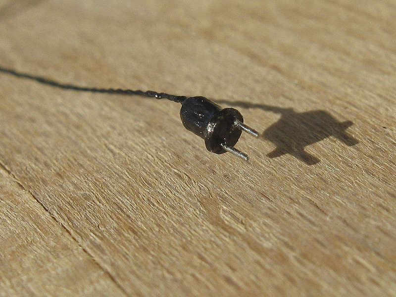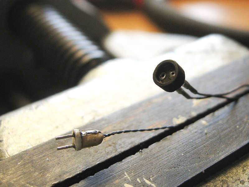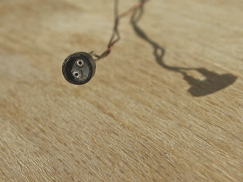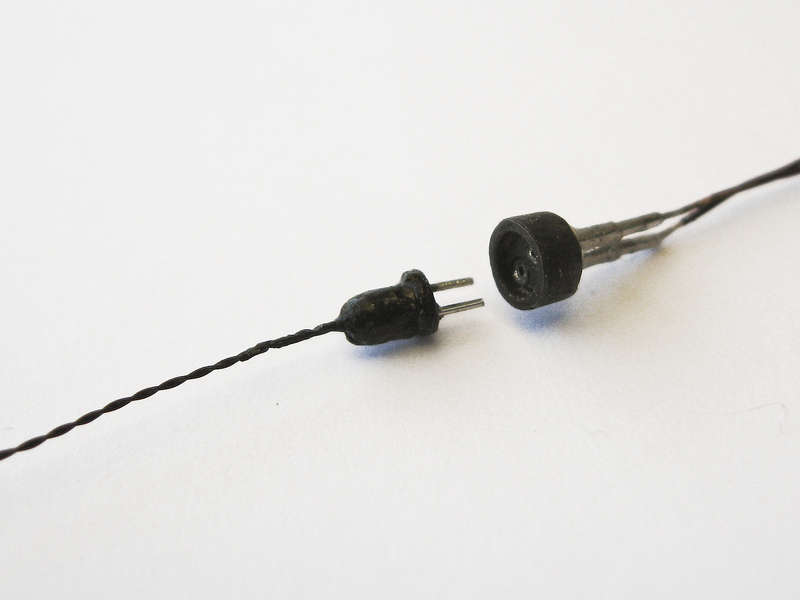 Base is a brass casting socket by Frithjof. The looming holes for the plug had to be enlarged to 1 mm and drilled through the complete casting which then was cut off. 0.65 mm hypodermic needles with some soldered enamel copper wire serve as shafts for the 0.3 mm plug pins. The upper plastic part of the needles was sanded and filed down to 1 mm diameter using the Dremel as a lathe to get them fitting to the holes.