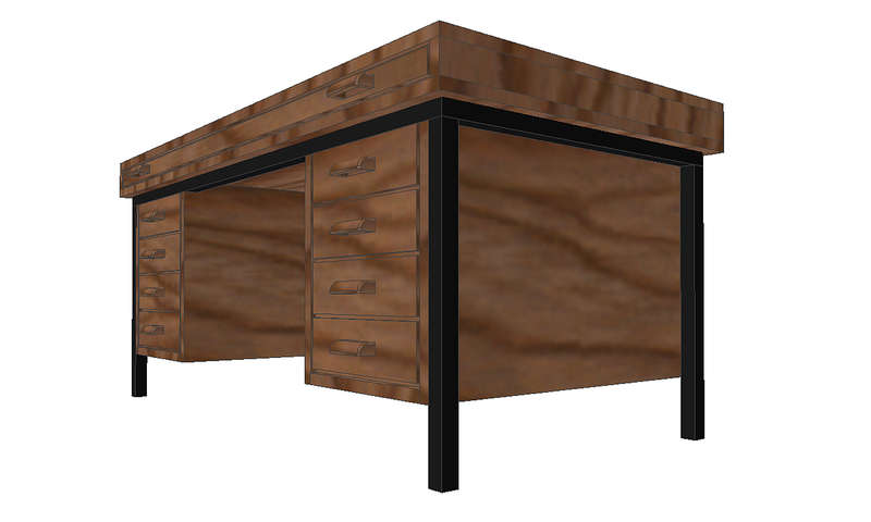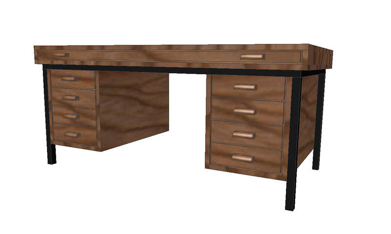 The other, more difficult point is that my consulting former Kuhlmann engineer, Mr. Wackerfuss, told me of special desks for larger offices, which could be aligned right behind the next drafting table. They had clearance for the neighbour's drafting table's weight, some drawers and a larger shelf for the biggest drawings. I made a cad drawing according to some measurements I got from him, but there's no picture available at all. I'm a bit hesitant to model those because in my estimation their design looks rather like late 1960s or even 1070s, which doesn't match my 1950s era - but I'm not sure about it. Maybe some of you guys might add some information to that? That's what they seem to have looked like:
