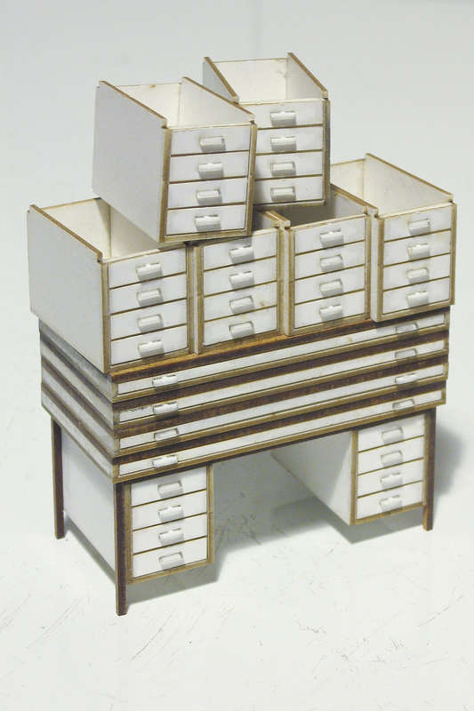 According to Mr. Wackerfuss there were more "professional" tables like the simple wooden ones I used and the drawers all had swivel chairs. But: When I researched the web for pictures of drawing offices from this era I often found rooms which were rather moneysaving equipped like the one I made: With simple wooden tables and chairs. Making this a perfect 'Kuhlmann show room' would mean to replace all furniture, and I'm not to sure, if it would really add to the model. If there are some opinions about it I'd be pleased to discuss them.