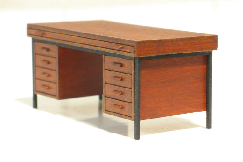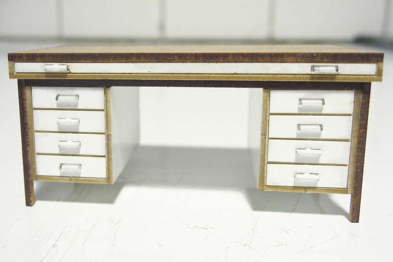 When I had the opportunity to lasercut all the windows' parts for the other project there was some sheet area available which I didn't want to have unused. I wanted to have the desks as simply manufactured as possible, but didn't want to omit any detail. The drawer handles are 3D-printed. All other parts are lasered from 1 and 0.5 mm cardboard, the steel frame and legs from 1.5 mm MDF. Drawer layers have square cutouts to house the handles and to ease mounting and aligning. I used aluminum angle section and blocks for rectangular results. After glueing all parts to the first desk I realized that first coloring wooden and metal part before glueing makes things much easier.