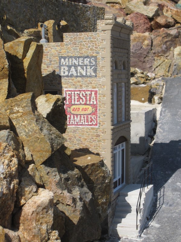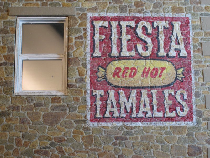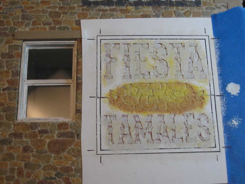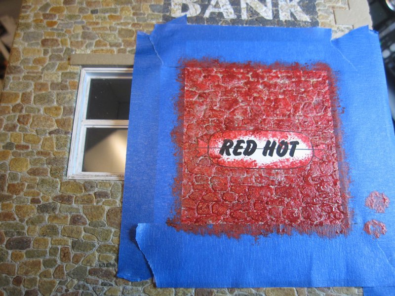 I cut a mask for the "red hot" lettering and painted it. Then I touched up all the edges, hand painted a thin drop shadow on the lettering, and added a black outline around the tamale. Finally, the entire wall was given a very wash of "mortar" colored paint, while the building was laid on its side. This helped to fade out the signs, and also toned down the colors of the stones a bit and very subtly tied the whole thing together:
