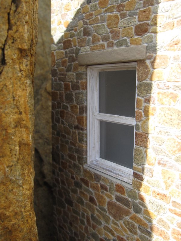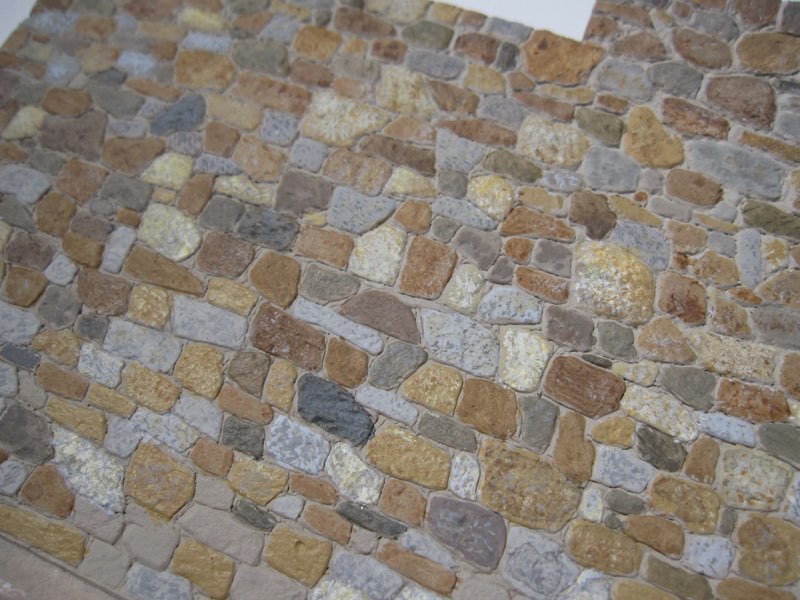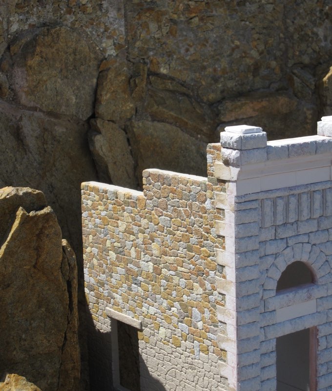 Here's a closeup of the stones. I found that the key to making them look right is not to use a single, solid color on each rock. They need some variation. And in this case, where there will be a real stone wall next to the model building, it was crucial to match the real rocks as closely as possible. In this shot you can see just how much detail I painted into each stone: