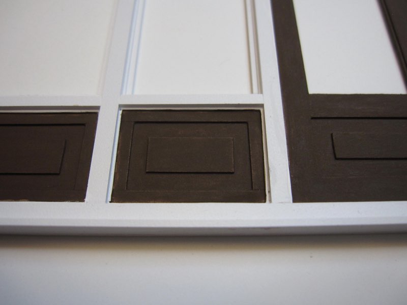 I painted these by hand using a small, pointed brush. Getting a sharp, clean edge between the frame and door was tricky. I painted everything white first. Then I painted the panels and door brown, building up the color a little at a time in thin layers. Then I had to touch up the white, and then touch up the brown. Eventually it reached a point where it was acceptable, though not quite perfect:
