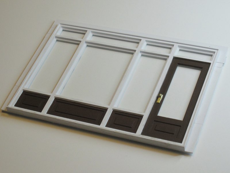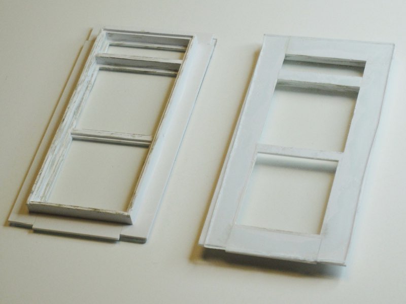 The upstairs windows were painted white and given a bit more weathering, since it's likely they would not be repainted as frequently. The weathering was done by lightly applying random streaks of gray-brown, using a ratty old brush. After painting was completed, the glass was glued onto the rear: