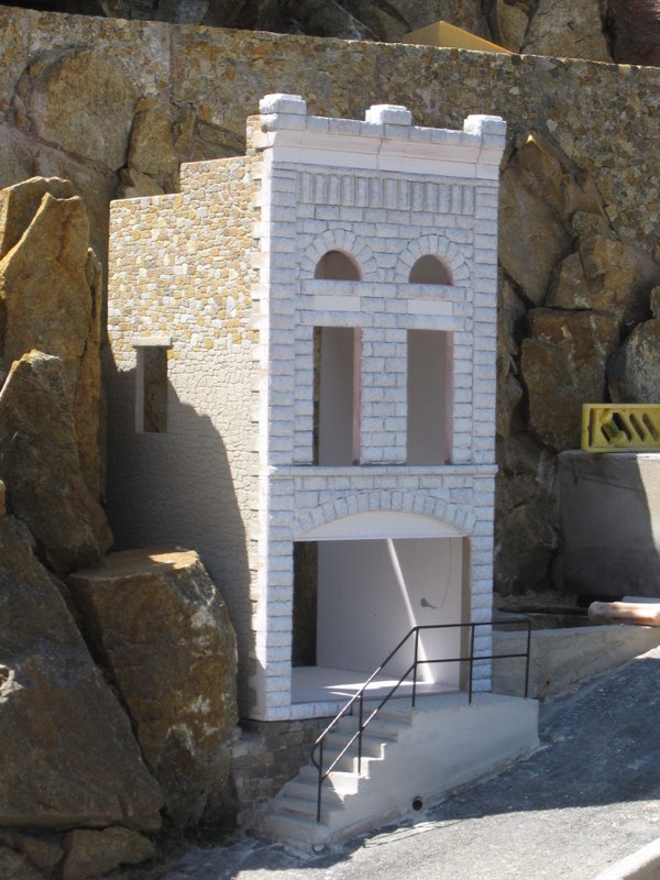 This next photo shows the building temporarily in place on the foundation. Although the real stone wall is in shadow, you can still see how closely I was able to match the look on my painted stone wall: