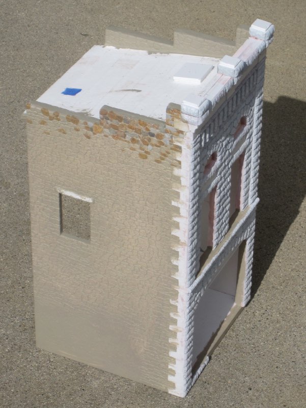 This looked pretty close so I decided to go with it, and painted the side of the building. I thinned it with water so it would go on thin and not clog up all the texture details I had so laboriously created. On the building, it seemed even darker: