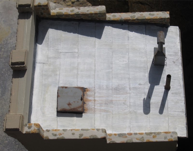 The "rolled roofing" material was painted black, then given several thin washes of white following by some brownish gray washes. This simulates the appearance of roofing which is somewhat aged and weathered yet still in reasonably good condition. I also painted the access hatch and glued in the smokejack and vent pipe: