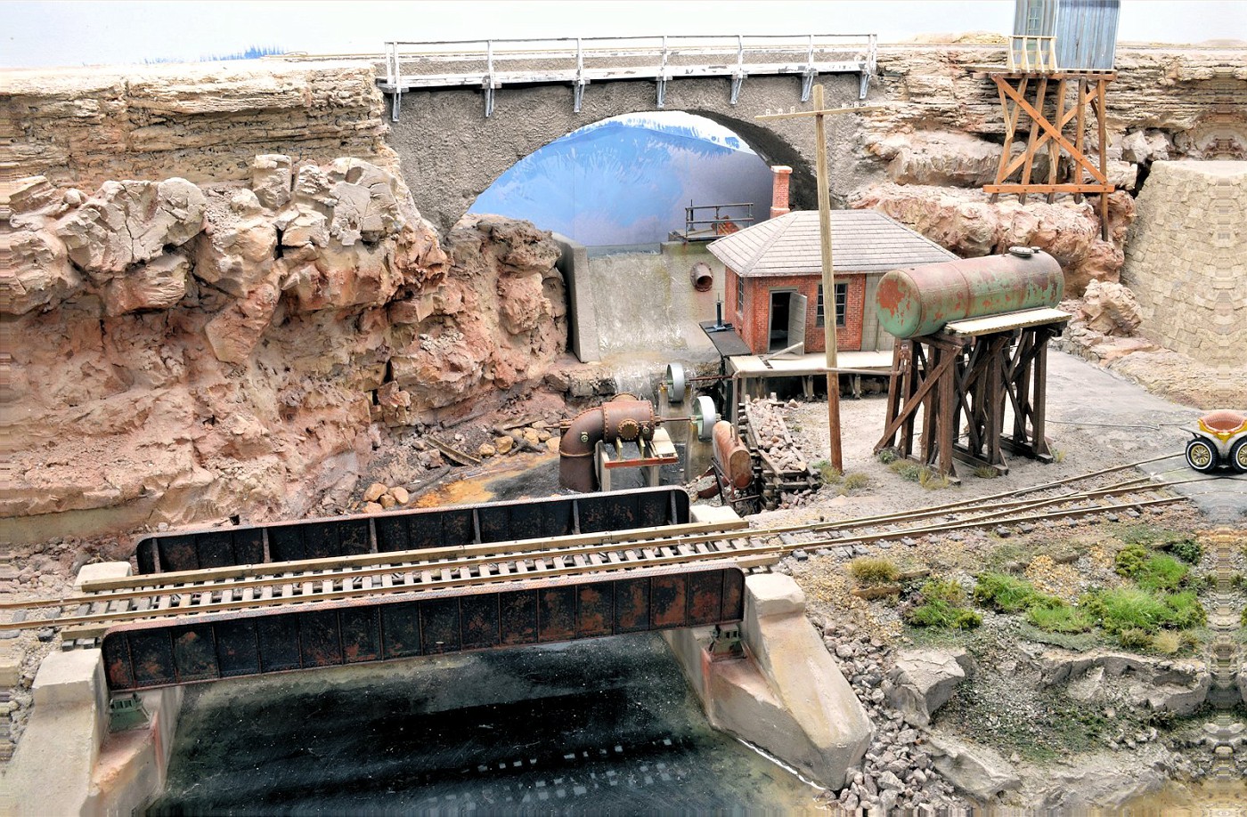 I had thought about that .. and put it aside. Hmmm. I need a smaller tension pulley to do that. Once I have both transmission pulleys in place I need to insert the tension pulley in the center .. before the belt. In the meanwhile .. I cut into the bank to set the pulley support in place. Once I am happy with it, I can glue it in place - which will effectively tell me where the second support will go. Once that is done I need to finish adding the control handles to the turbine and cement that in place too. Then I can 'boil' the water around everything. Notice that under the layout lighting the colors aren't so saturated as earlier photos taken on my work bench.