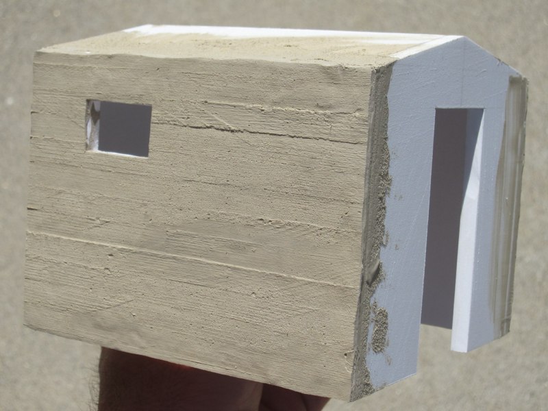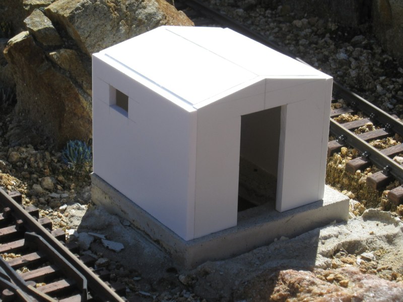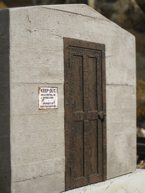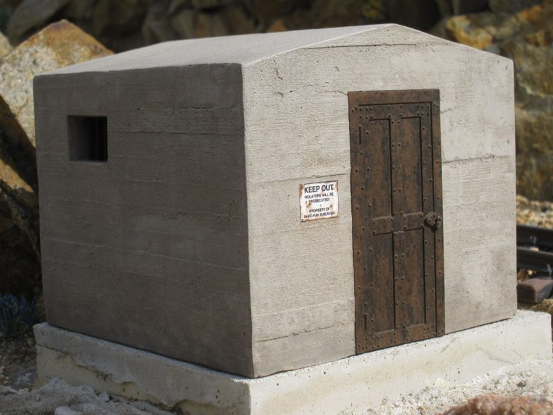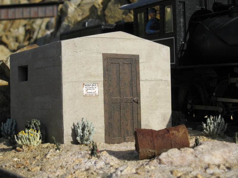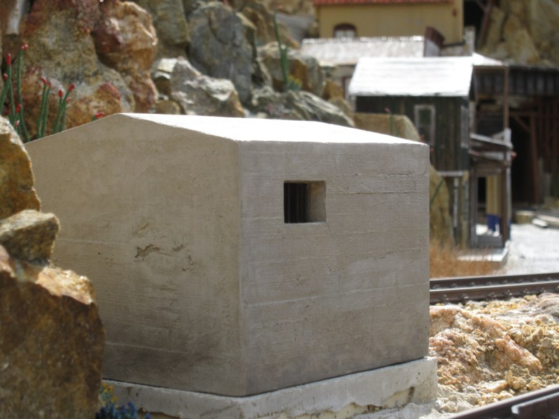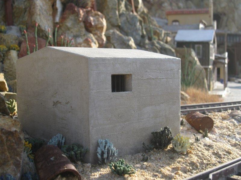 For a long time I had wanted to put a building there, and finally decided that an old, concrete jailhouse would be just the ticket. It would be smaller, but similar in style and materials to the jails in Rhyolite, NV and Julian, CA. I could have built a form and cast the whole structure in real mortar, but I preferred to build it out of Sintra PVC board. I just had to come up with a way of texturing Sintra to look like cast concrete.
