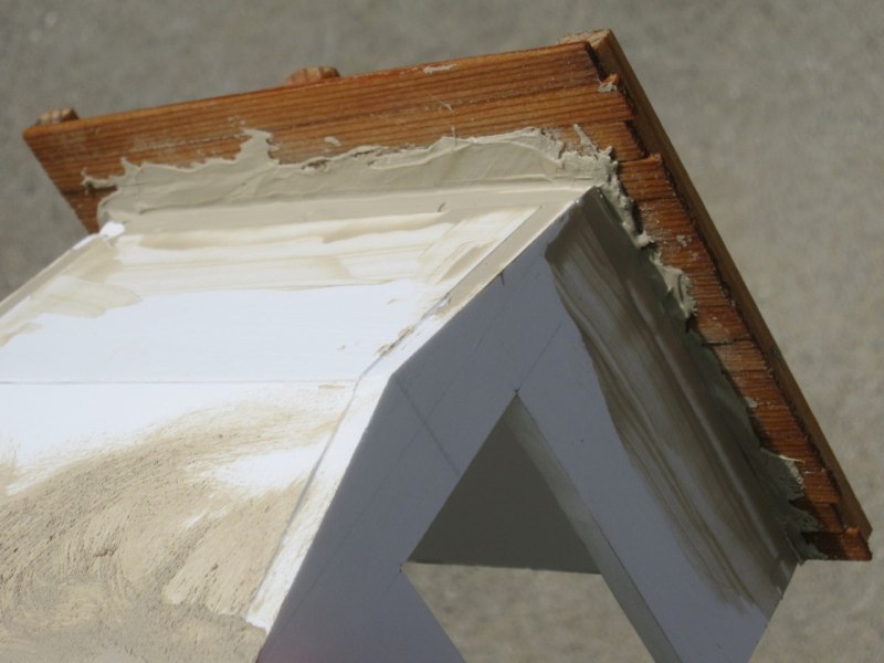 The roof would not need imprints of a wooden form, so I just used a spatula to spread the molding paste/stucco/paint mixture onto the surface of the roof. It took a couple layers, letting it dry in between. Then I sanded it a little to smooth out any excessively rough spots.