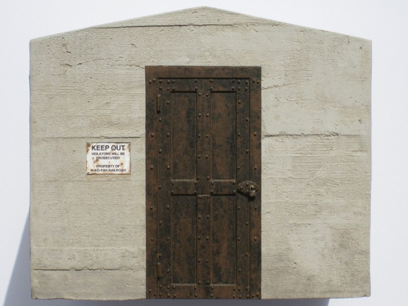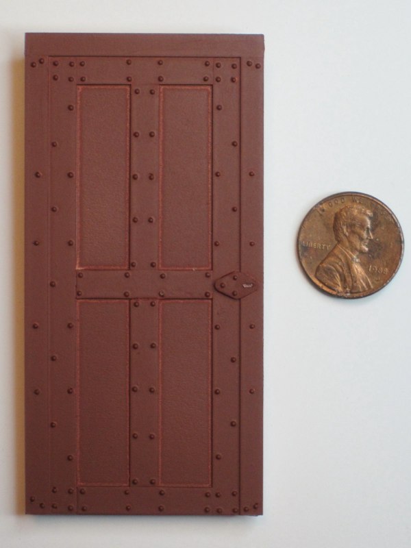 The door was patterned after the riveted steel door of the Rhyolite jail, though not an exact replica. It was made from styrene strips glued to a block of 6mm Sintra PVC. I used .030" Tichy rivets set into drilled holes. Here's an in-progress shot: