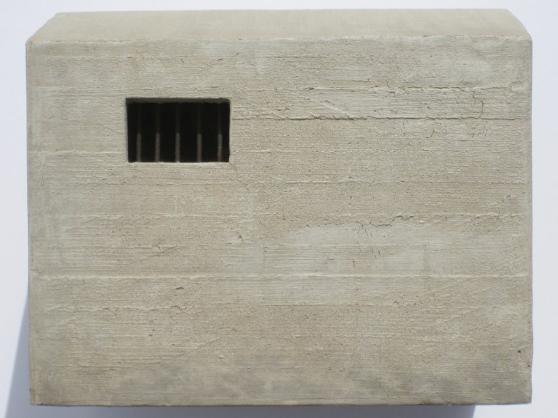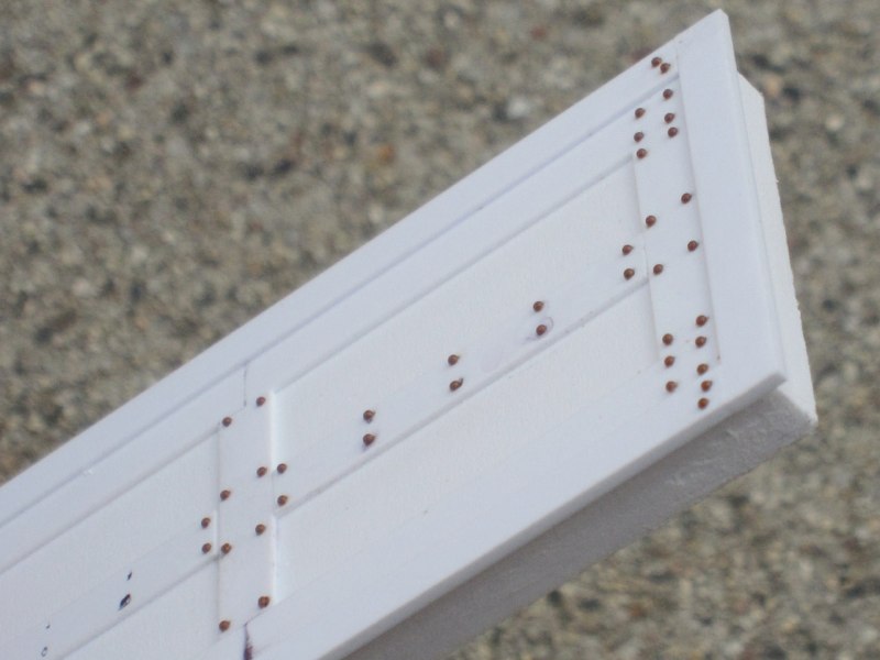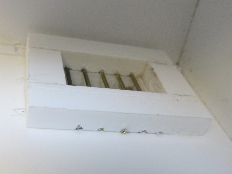 A thin coat of the stucco/paint mixture was spread onto the edges of the window, and around the bars. When dry, excess material was scraped off the bars, and the rest was sanded smooth. The bars were chemically blackened, then painted. Finally, a fine brass screen was blackened and glued to the interior, to keep out insects: