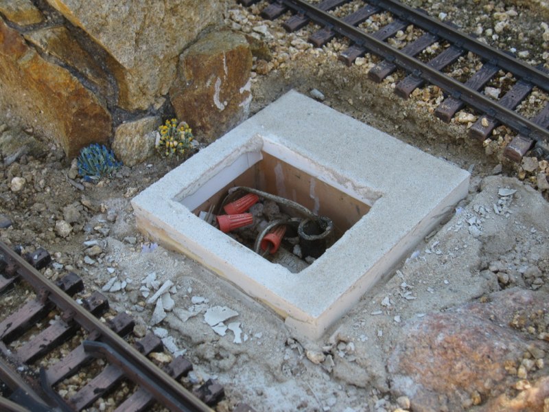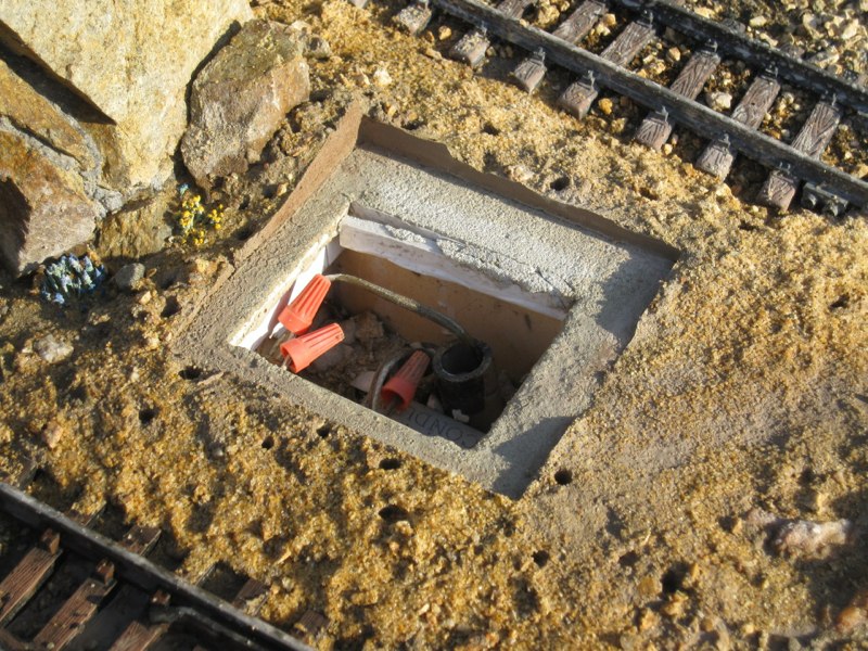Just past the east end of the town of Dos Manos, there is a wiring junction set into the ground between two tracks. Last fall I poured a mortar foundation around the junction box: