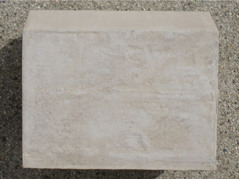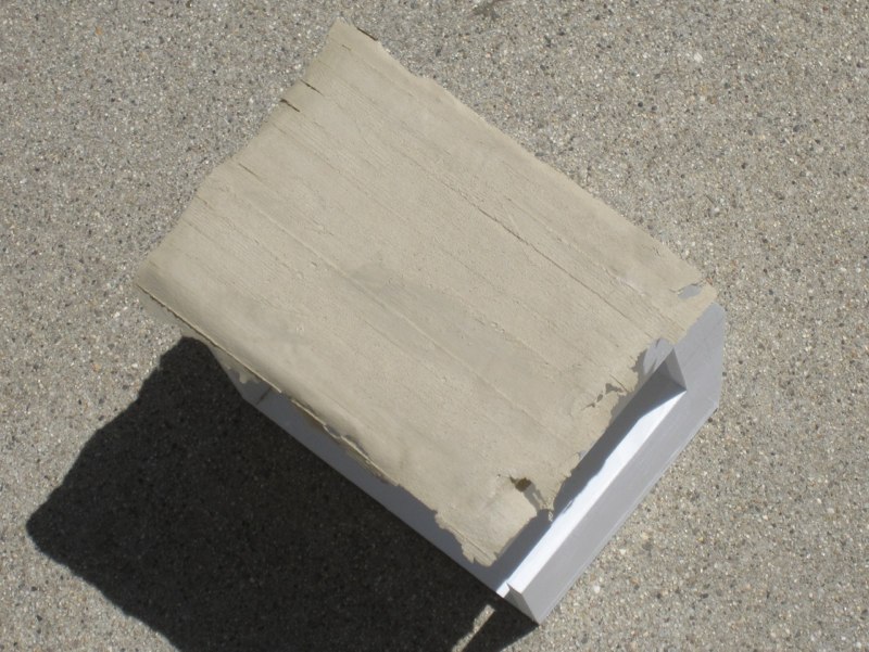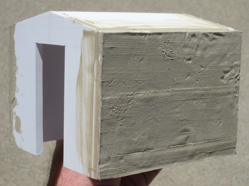 I mixed some acrylic molding paste with a bit of Liquitex "ceramic stucco" acrylic texturing gel, plus a bit of concrete-colored latex house paint. This mixture was spread thin over the form, and allowed to dry.