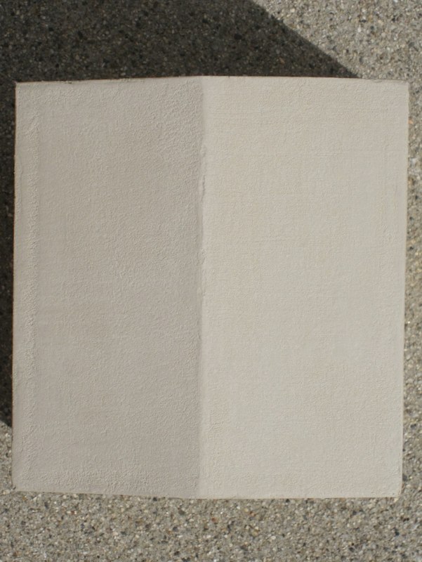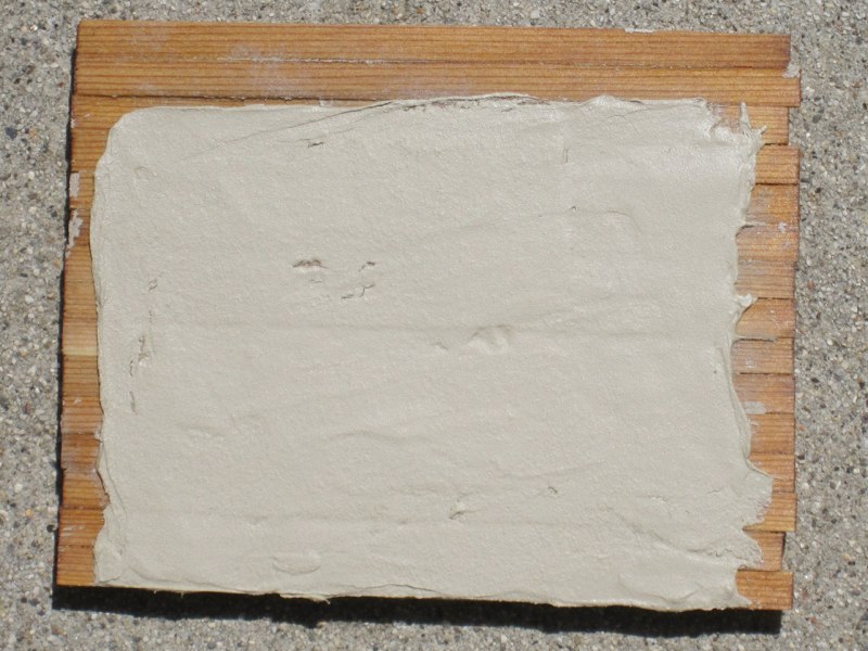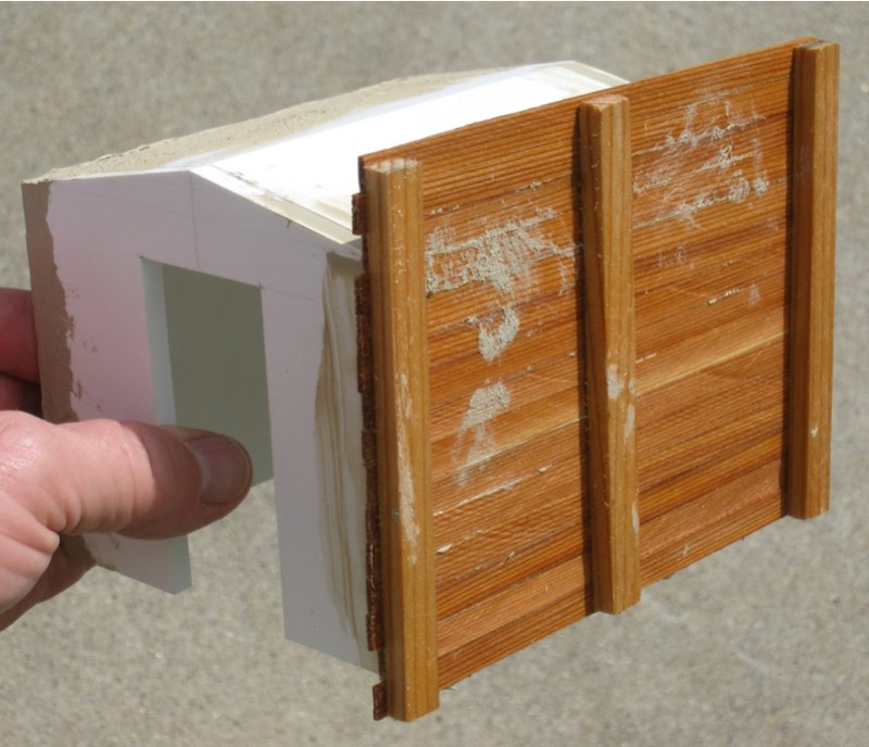 When it was thoroughly dry I peeled it off the form. Next I mixed some molding paste and latex paint, and spread a thick layer onto one side of the building. I applied the dried, textured sheet, starting at one end and carefully pressing it into the wet layer. The trick is to prevent trapping any air under the textured sheet. Then I let this dry for two days, leaving it in the sun as much as possible.