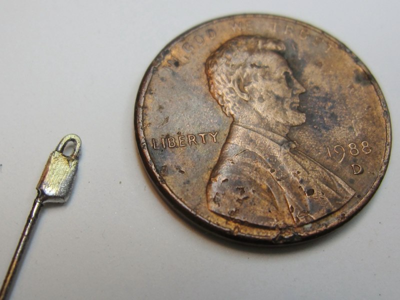 Naturally, I needed a padlock for the door, so I made one out of brass. I simply bent a thin brass rod into a U shape. Then I wrapped a strip of .001" thick shim brass around it, and soldered it in place. Later, this was cut off at the base and filed smooth: