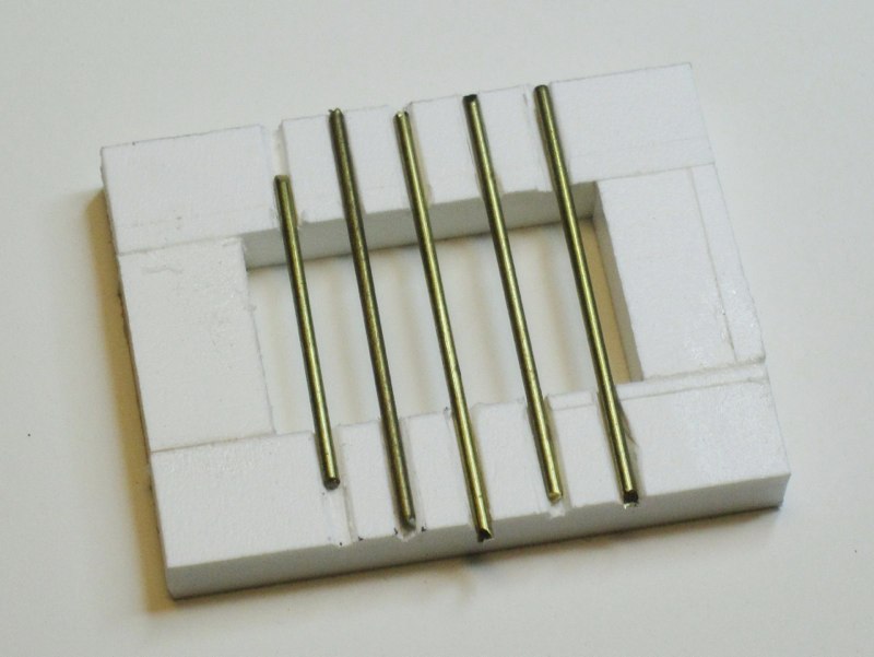 There is a small window on one side of the building. Of course, it needs bars. So I built a frame of 6mm Sintra. Brass rods were glued into grooves cut into this frame: