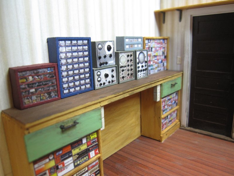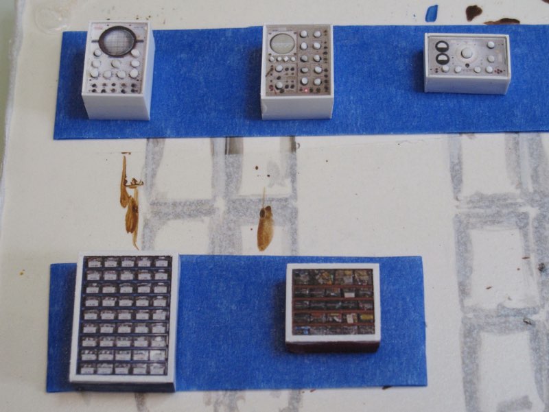 I also made some oscilloscopes and other instruments, using the same basic technique. To these I added bits of small styrene rod for dials and knobs. I also made some parts drawers too. Here's a shot of some of these things under construction: