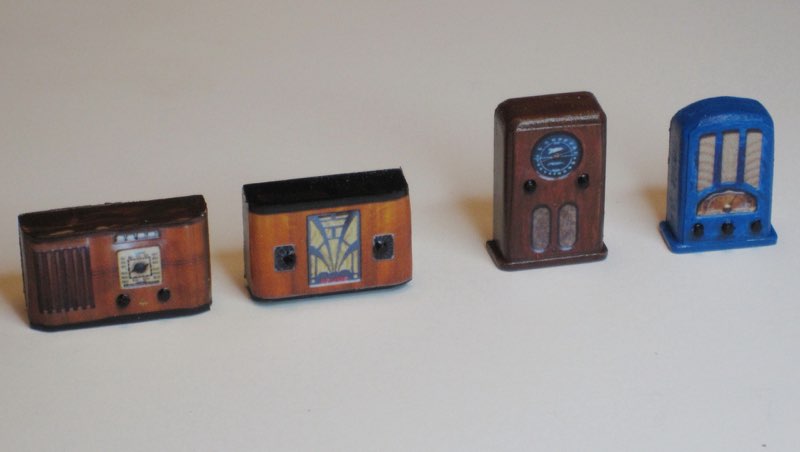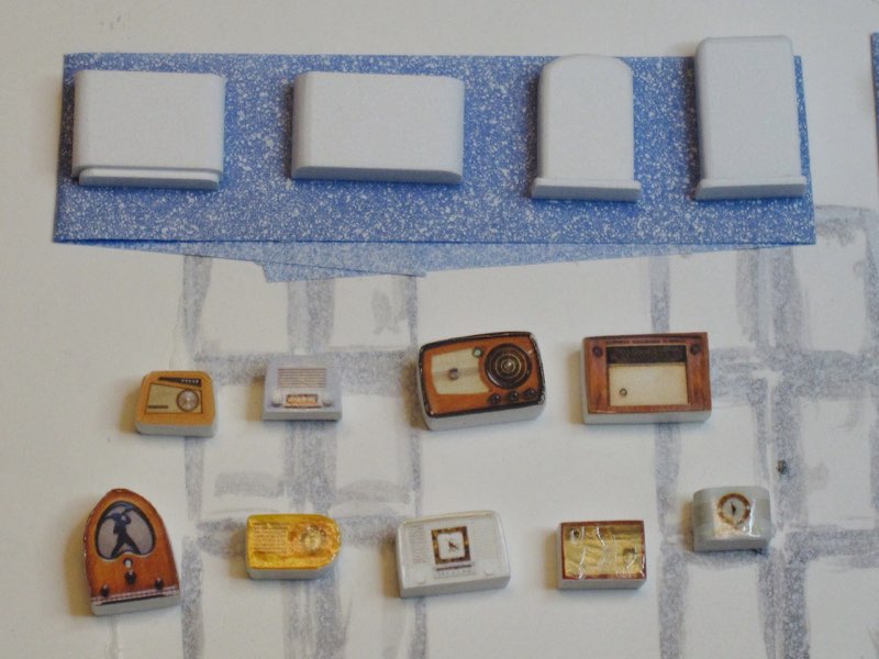 In the lower half of the photo you can see the beginnings of some smaller radios. To make these, I found photos of old radios online, reduced them to scale, and printed them on self-adhesive vinyl. Then I stuck them onto 6mm Sintra, and cut them out. Later, they'll be painted on the sides and top: