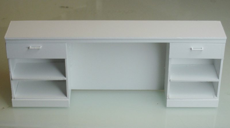 Later I glued styrene strips around the edges to simulate wooden shelving. This will go on top of the workbench. I made some more of these, sized to fit into the shelves below the workbench.