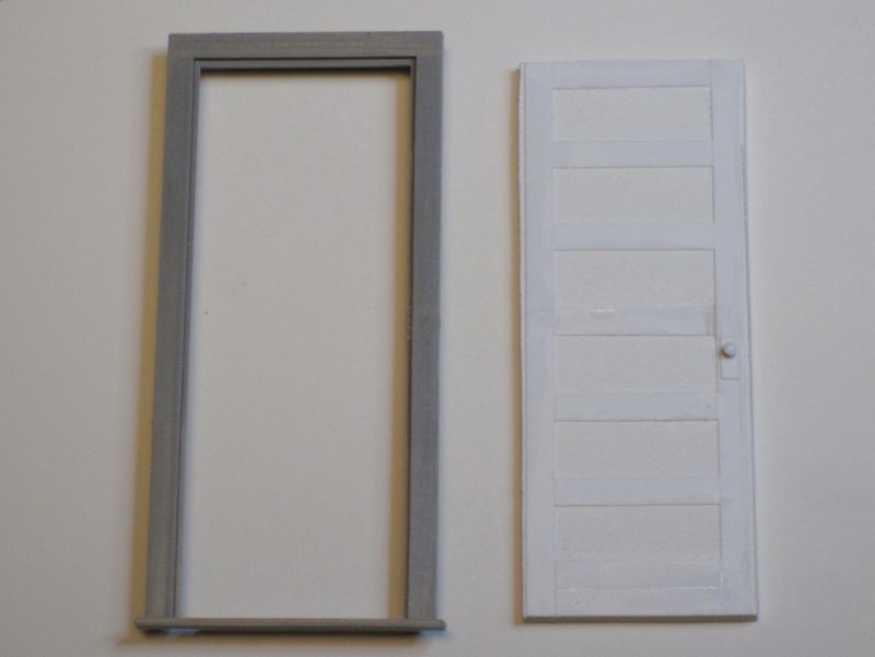 I cut out an opening for a door in the rear wall of the radio shop. I cut down the plug from the opening and added some styrene strips to it, to make a door. The doorframe is from Grandt Line: