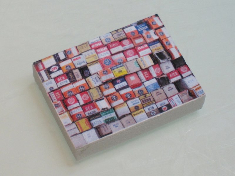 I found a photo online of a stack of vacuum tube boxes, so I scaled it down and printed it onto self-adhesive vinyl. Then I stuck it to a scrap of 6mm Sintra and cut it out. To give it a bit of dimensionality, I used a tiny jeweler's screwdriver to create indentations between the boxes.