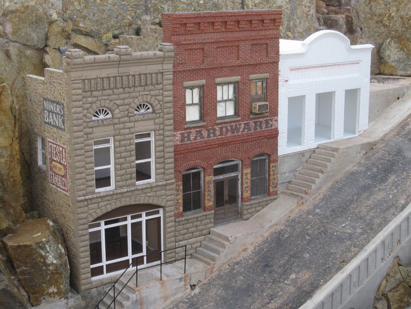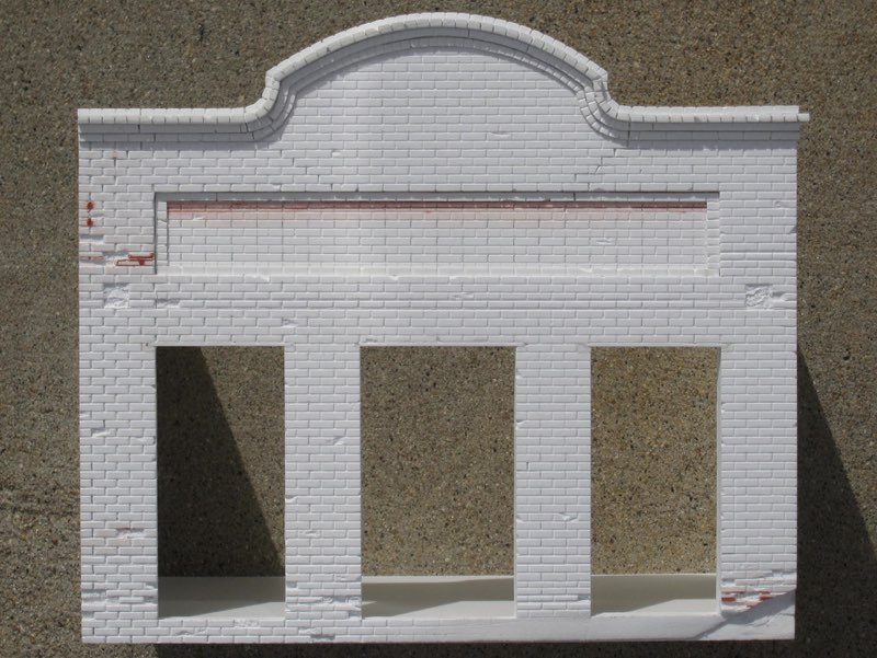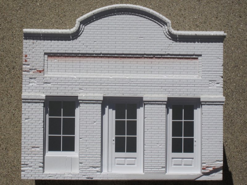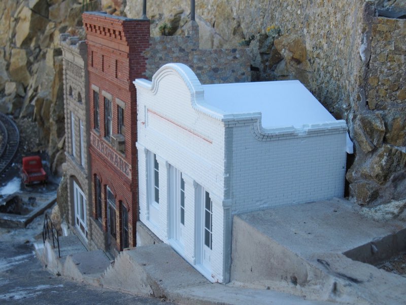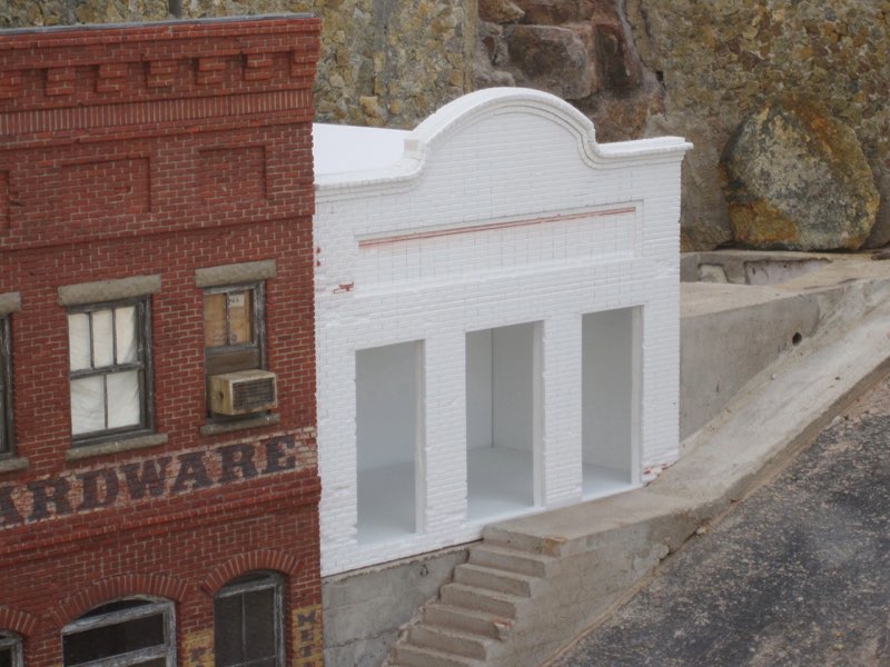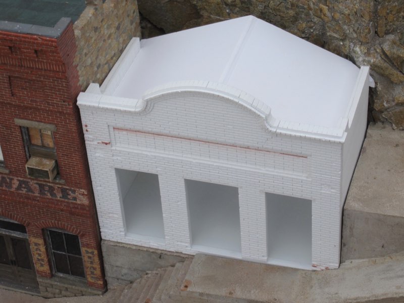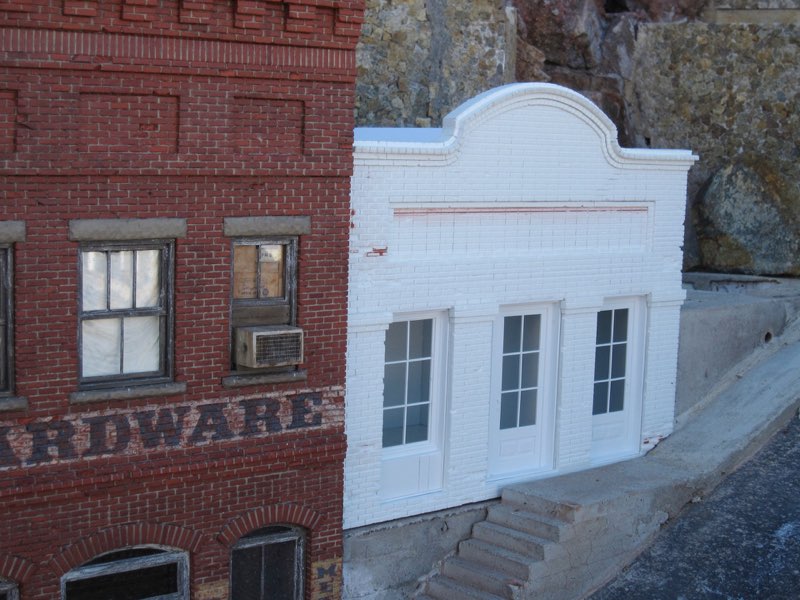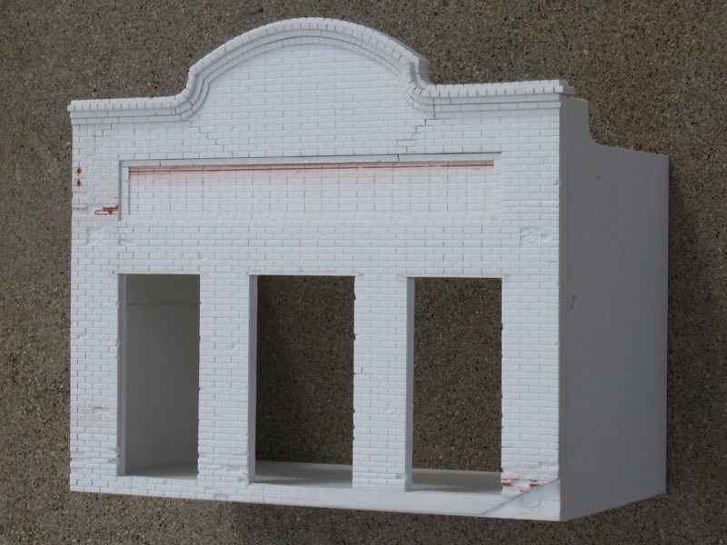 This one will have a worn coat of paint over the bricks. It is loosely based on this general store (and former hotel) in Eureka, NV: