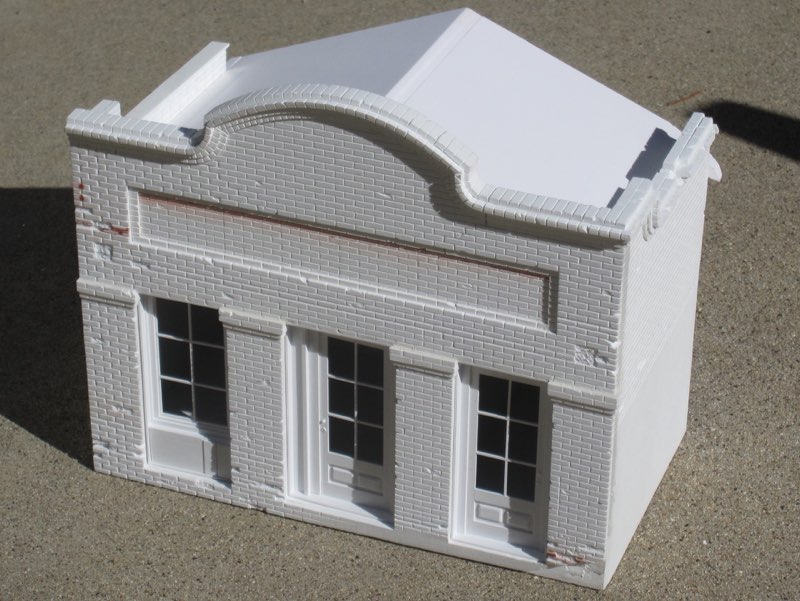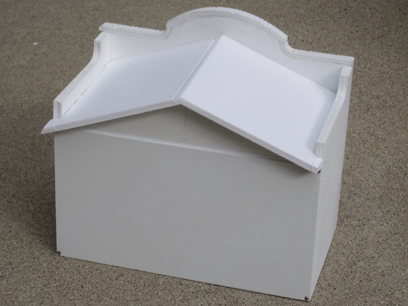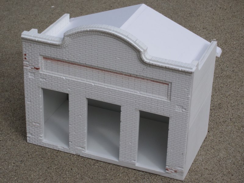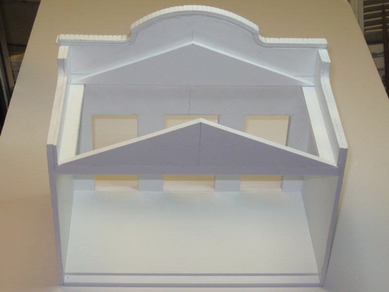 Here's how the building looks so far. I have the roof on, and the removable rear wall. The rear wall is secured with screws for easy access to the interior. The interior details will be built into a box that can slide out the back: