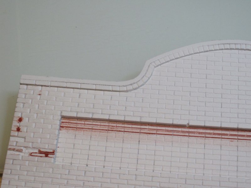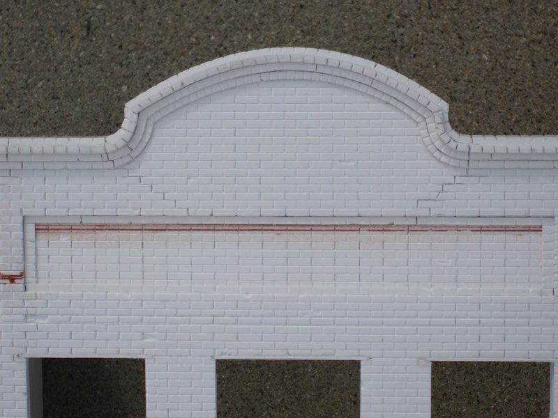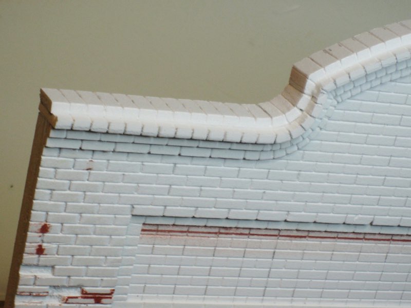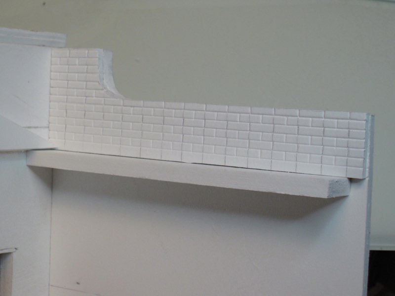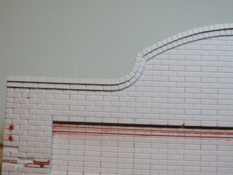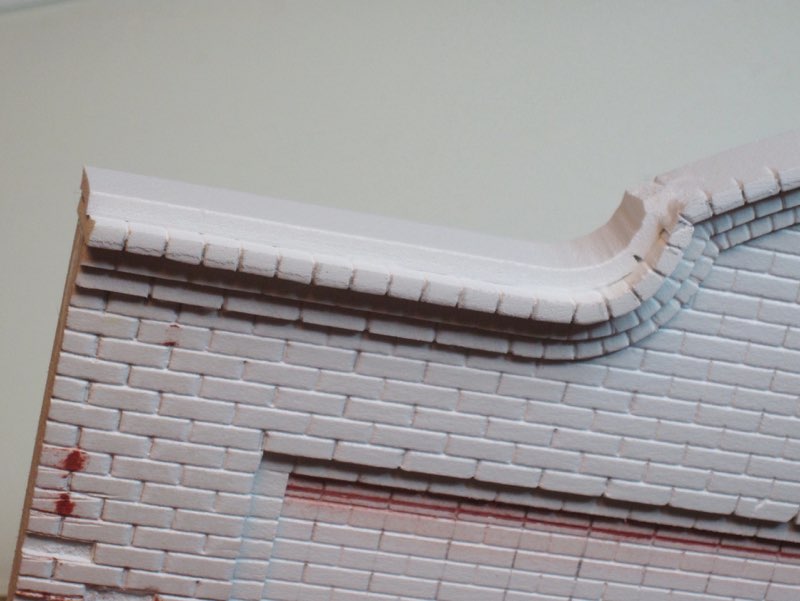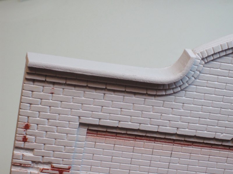 To create the multi-level trim along the top of the wall, I started by cutting out a 1mm thick piece, two bricks high, to match the shape of the wall, and glued it in place. Then I scribed bricks onto the lower course: