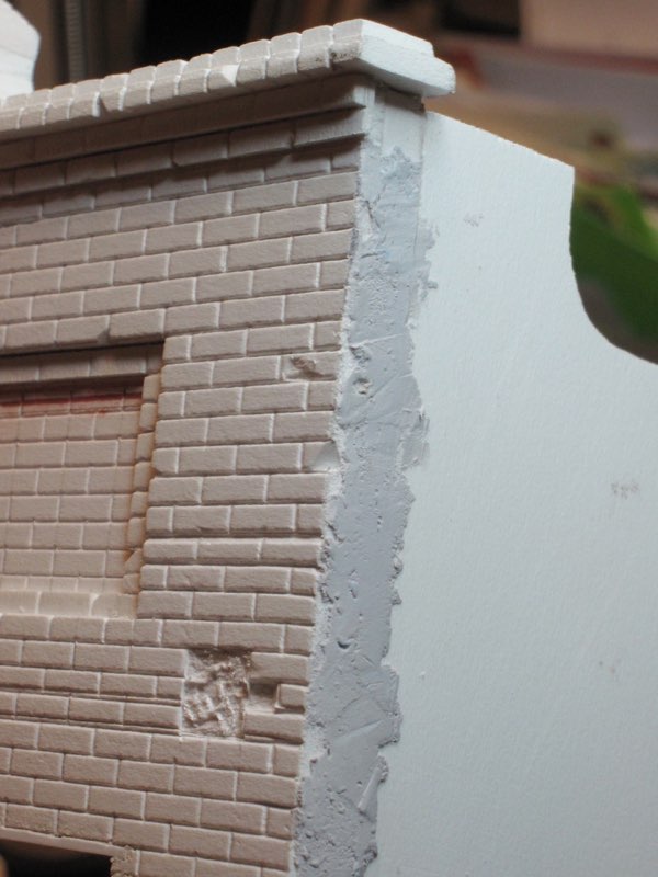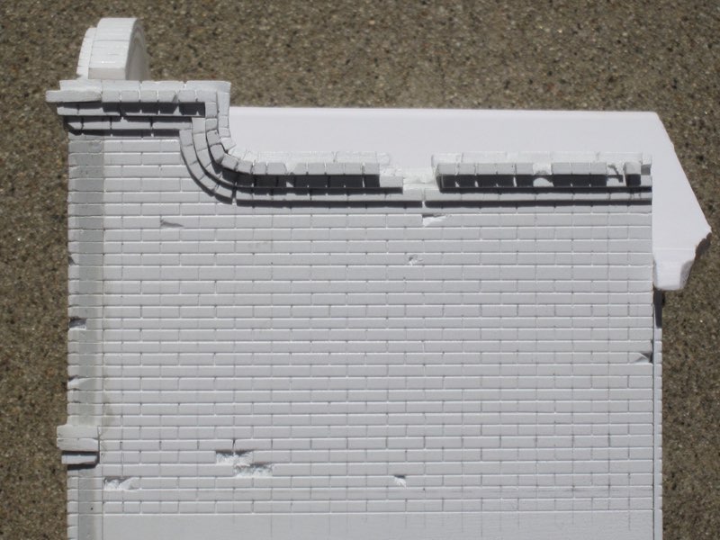 I also finished scribing the bricks on the side of the building, and added the trim along the top of the wall. Then I carved out some areas to look like bricks had crumbled or fallen out: