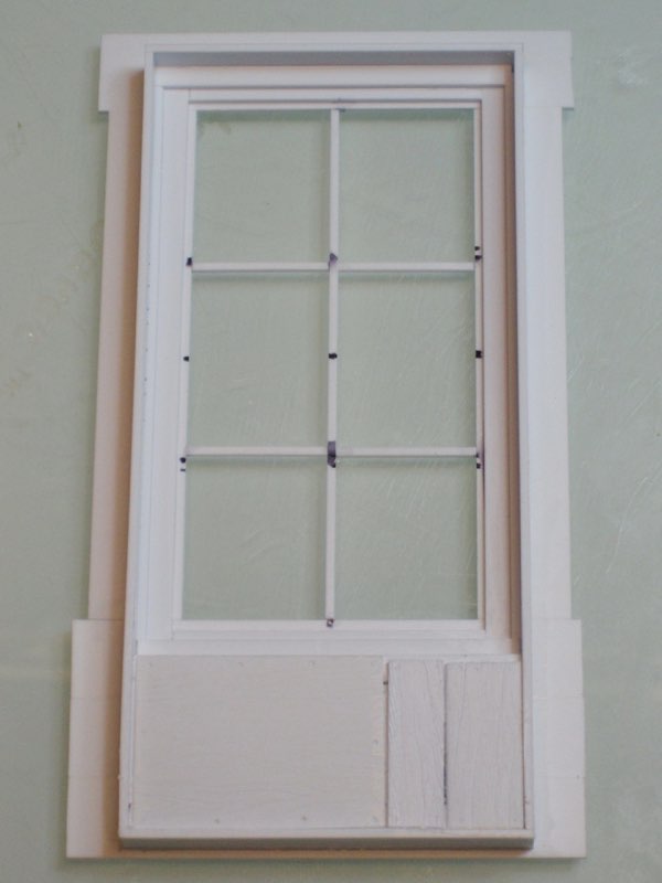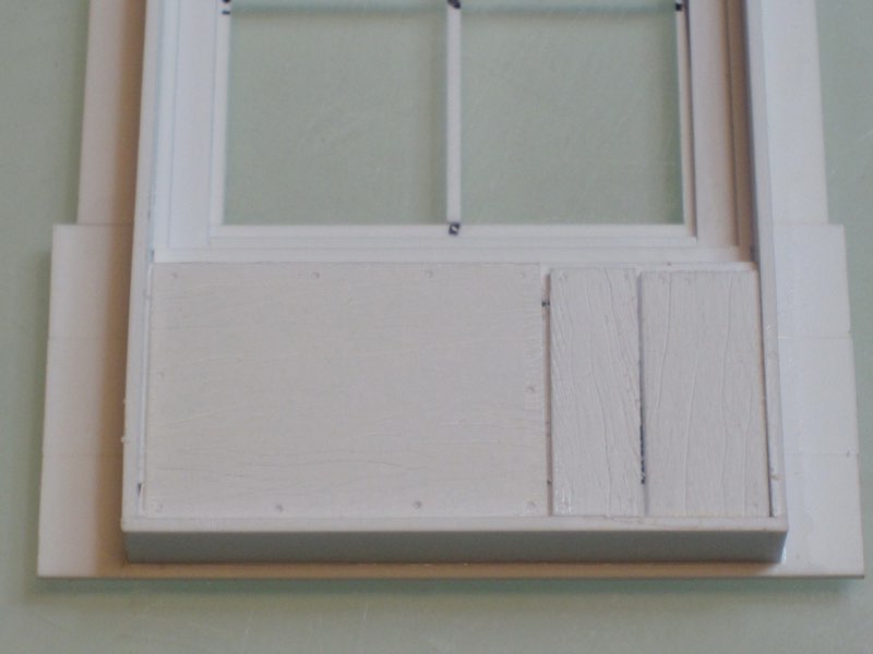 The bottom of the window frame is a solid panel. I was originally going to make it match the doors, then I decided to model it as if it had been crudely repaired with a pair of planks and small plywood sheet. It's a bit hard to see in the photo, but I scribed wood grain into the planks and sheet, including some small cracks, to represent weathered wood: