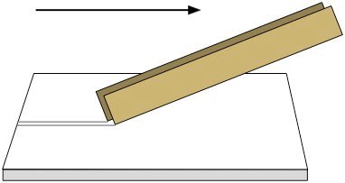 I've had some questions about how I use the double-bladed scribing tool that I made, so I drew up a simple diagram to illustrate it. The tool is held at an angle to the surface, and pressed down. Then drag it across the surface in the direction of the arrow. For clarity, I did not draw the metal ruler I use as a straightedge: