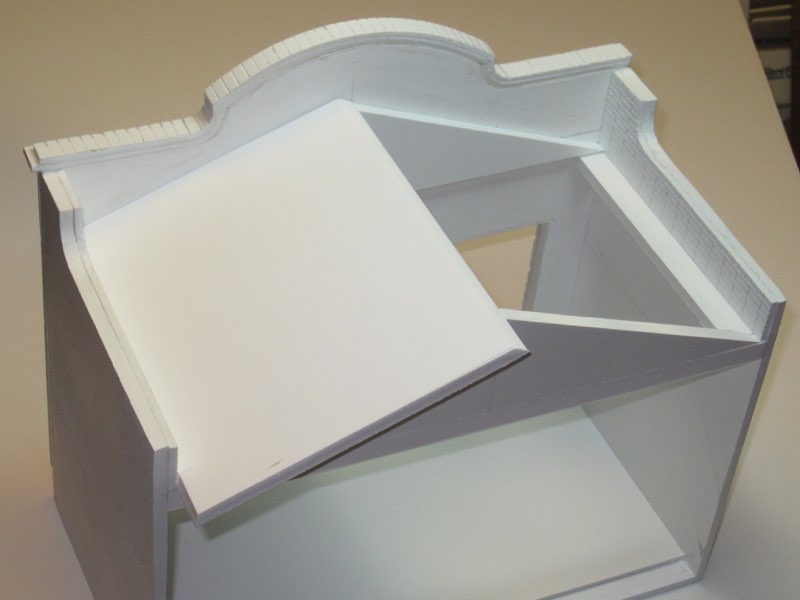 On the inside of each side wall, I added a small piece of 3mm Sintra, scribed with bricks. Below this I added a "shelf" of 6mm Sintra to support the roof: