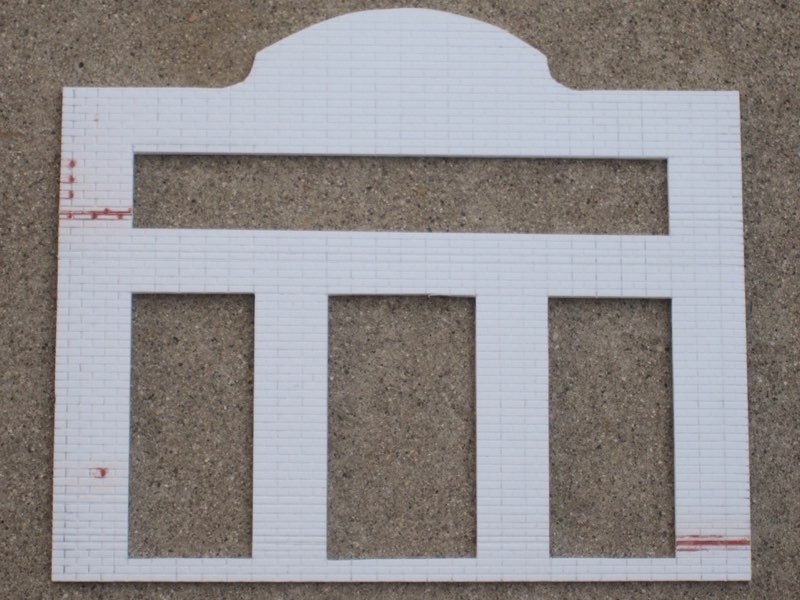 I got a little bit done on it back in August. At that time I managed to cut out the shape of the front wall, and scribe the brick pattern. This was a piece of 3mm Sintra PVC foam board. I laminated it to a base of 6mm Sintra, which had a brick pattern scribed onto part of it, for the recessed area. (BTW, I was able to scribe a lot of the brick pattern in the waiting room, while Cris was undergoing a medical procedure. It's the perfect kind of project for that.):