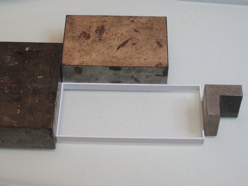 I built up the window and doors from various sizes of styrene strips. I work on a sheet of tempered glass, and use metal blocks to hold the pieces in place and keep the corners square. The large blocks are called "1-2-3 blocks". I don't remember what the 1" square angle block is called. I got these blocks from Amazon and they're really handy: