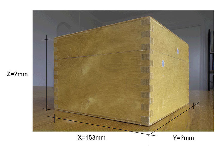 So I tried a little experiment. I wanted to see if I could calculate the correct height (Z) and width (Y) of this wooden box using only the picture and the length (X). I have made it a bit simpler for myself by taking the picture straight on without tilting the camera, so Z is unsharpened. So the challenge is to remove the shortening on X and Y: