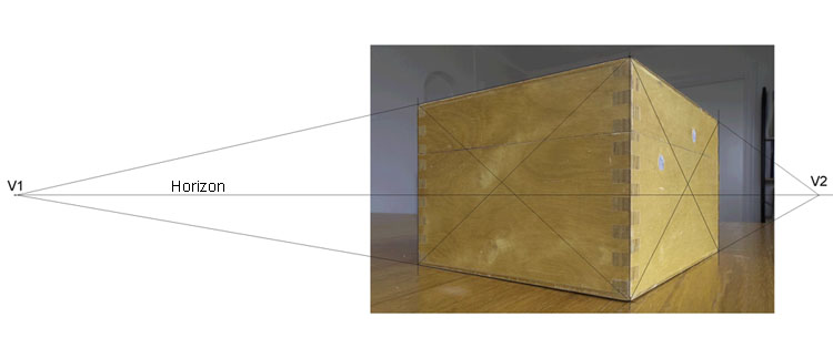 Using standard 2-point perspective drawing theory I established the horizon and two vanishing points: