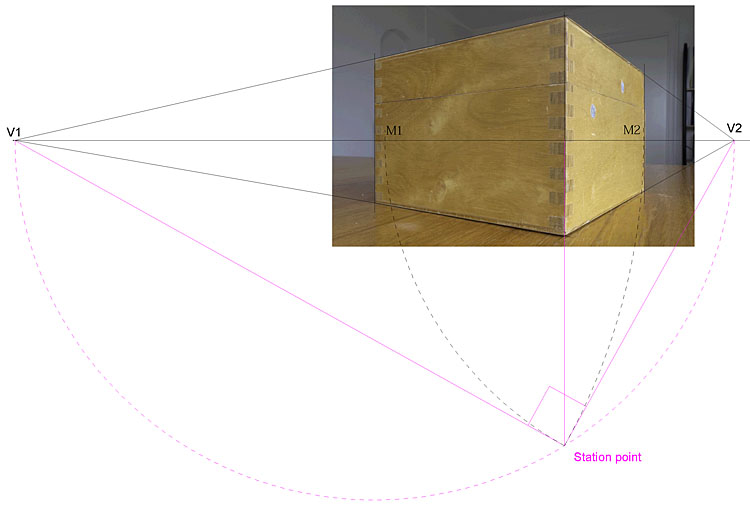 I know of a way of making a plan from a photo by geometry. You find the station point as you have done in your first post, but then you proceed differently, starting by drawing radial lines up from the station point through corners and edges on the photo.