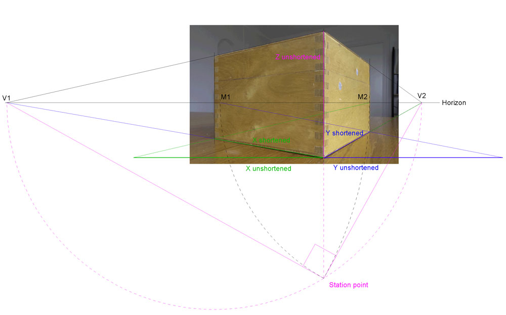 A perspective drawing of a box made using the exact same perspective drawing theory should be possible to "reverse engineer" into a scale drawing without any foreshortening.