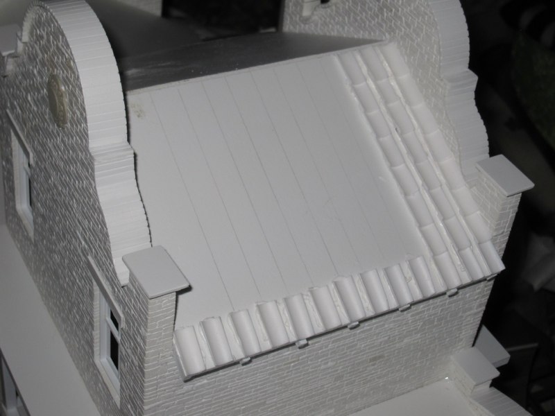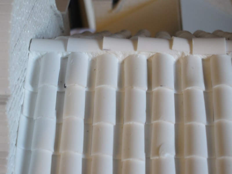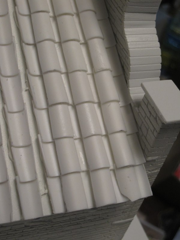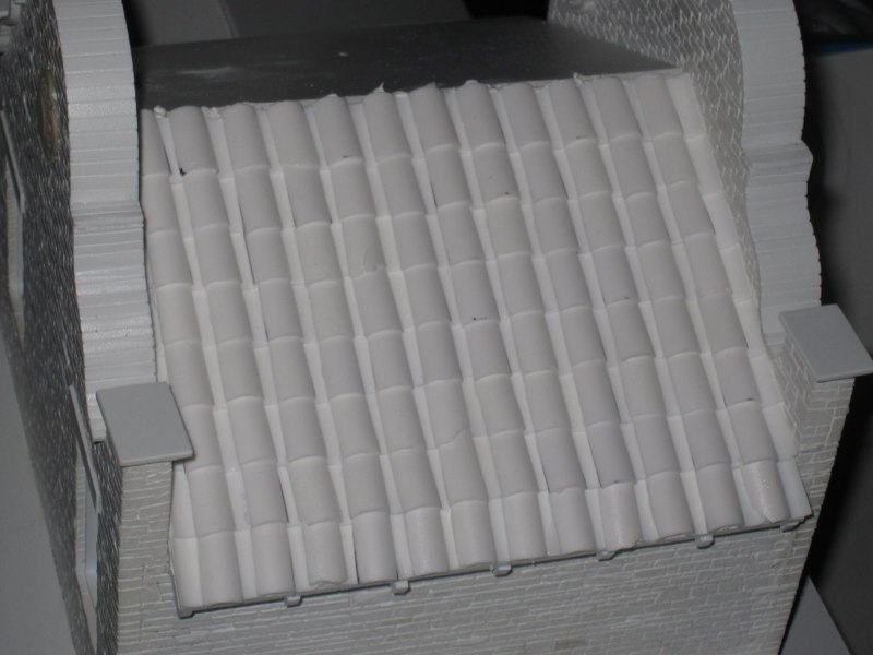 After spending a few days cutting up styrene tubes and turning them into Spanish tiles, I was ready to start gluing some to the main roof of the depot...