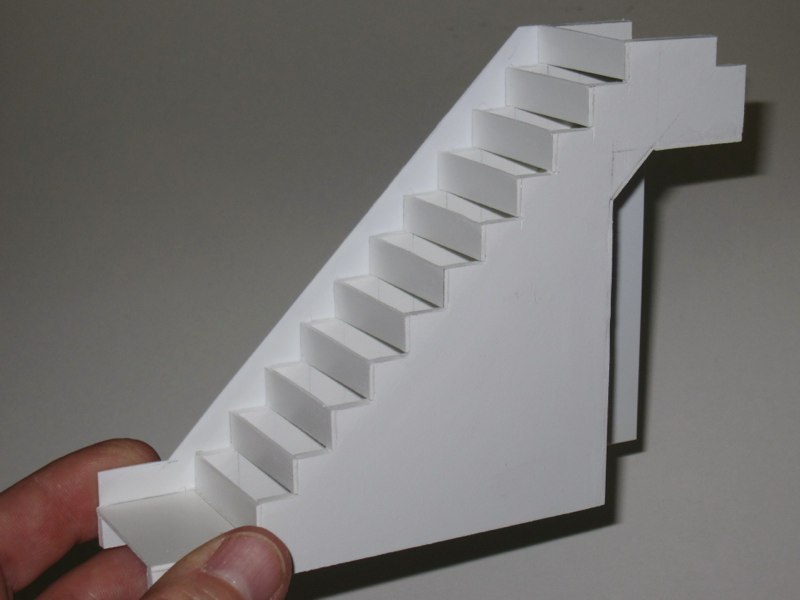 I managed to tile most of the north side of the baggage room roof, then ran out of styrene tubes and couldn't make any more tiles for a while. So while I waited for an order of tubes, I went to work detailing the interior. I built some stairs out of 4mm and 1mm Sintra, plus some .020" styrene for the baseboard. Here's a shot of the stairs under construction: