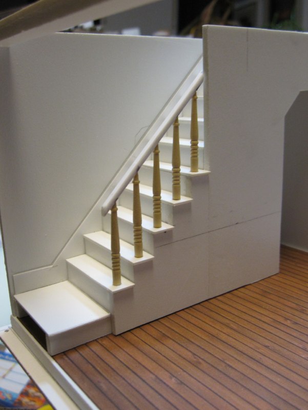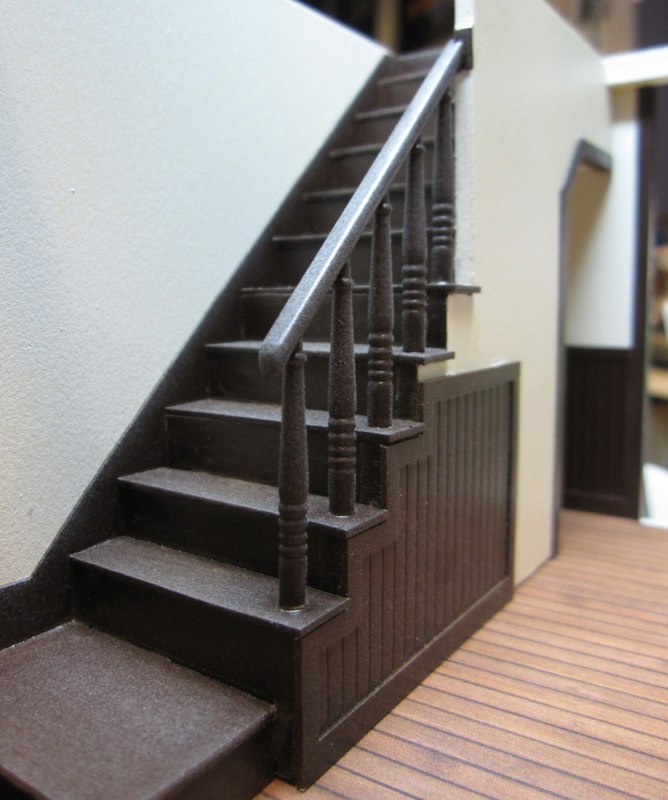The handrail was made from a 1/8" styrene tube. I sanded two sides of it flat, and plugged the end. Then I drilled holes into the underside and fit it over the tops of the balusters. BTW, the floor is a photographic image printed onto self-adhesive vinyl: