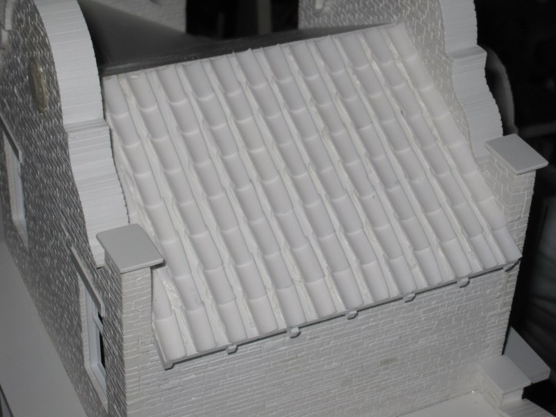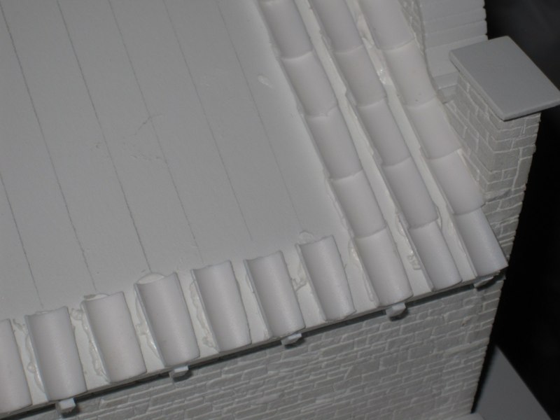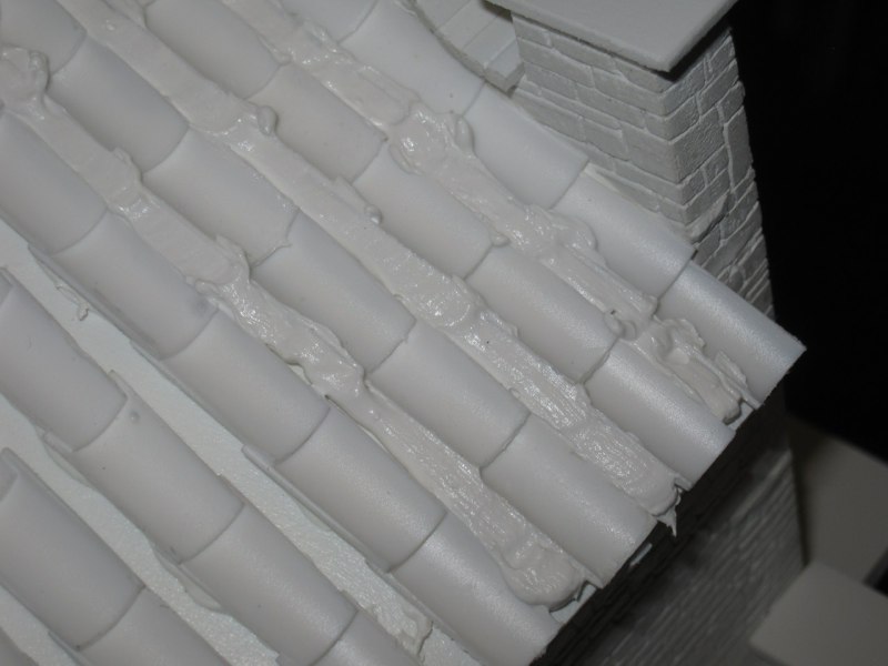 I finished putting tiles on both sides of the main roof, and capped the ridge. The gaps under the ridge tiles were filled with Dynaflex to simulate mortar: