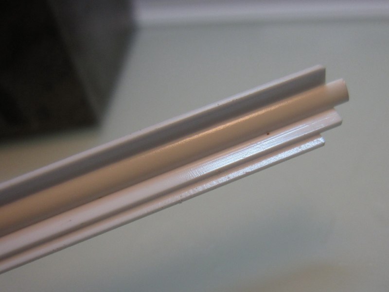 I made the crown molding from strips of quarter-round, L-angle and .020" thick styrene. These were cut and mitered to fit each wall, then painted, prior to being glued in place: