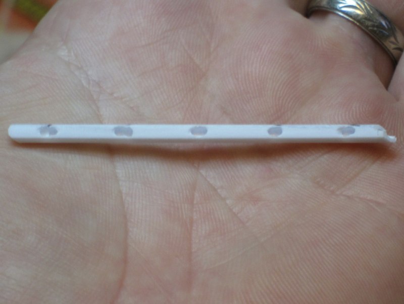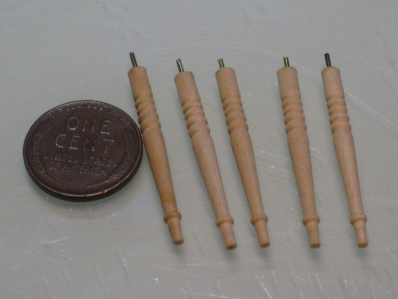 A few years ago I bought some 1/24th scale balusters from a dollhouse supplier, and put them away until I found a use for them. Much to my amazement I was actually able to find them now that I needed them. I drilled a hole in the bottom of each, and glued in a short piece of brass rod: