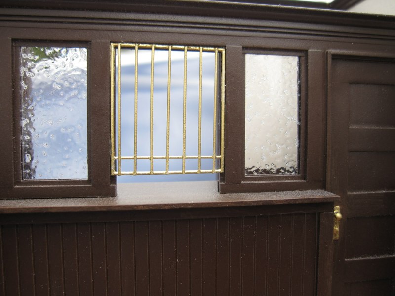Here's a close up of the finished ticket window. The rippled privacy glass was made from .015" slide cover glass, with clear gloss medium dabbed on the the back to create the rippled look: