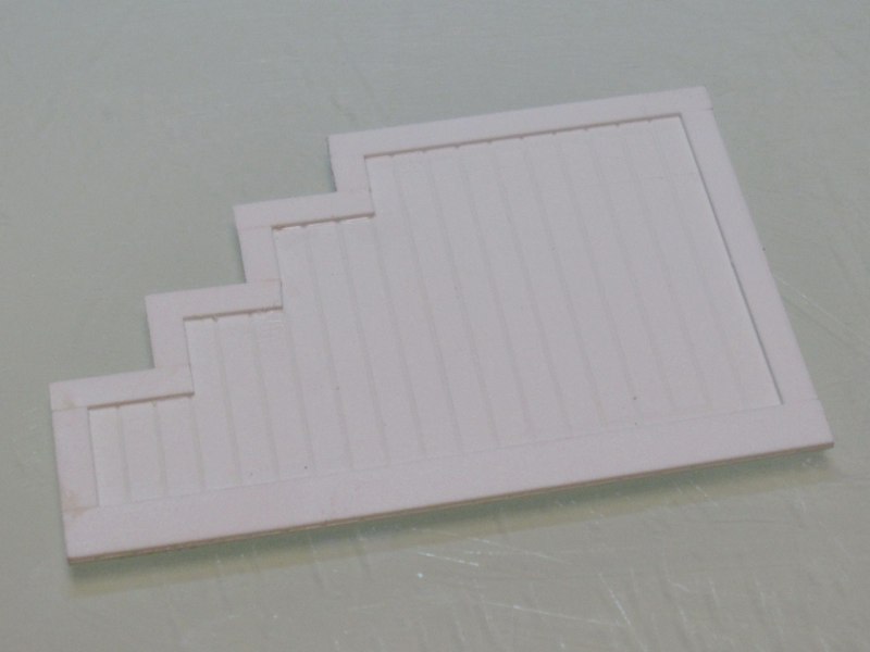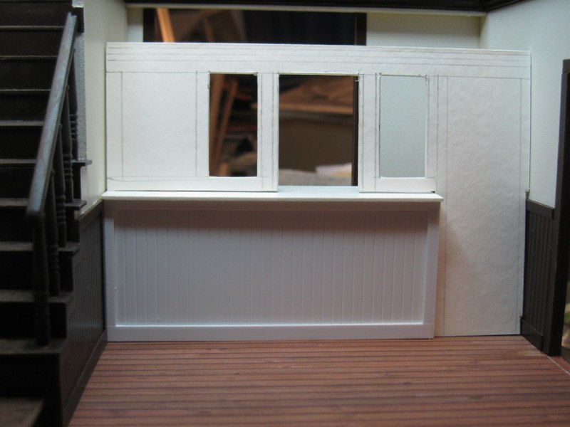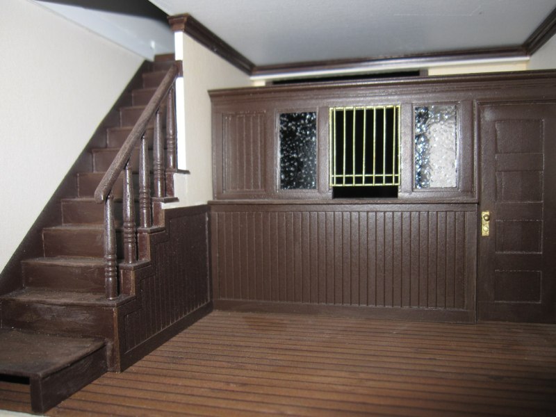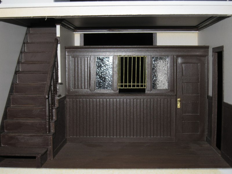 The interior walls will have wainscot. These were made from .020" thick, V-groove styrene sheet, with trim made from styrene strips. This one is designed to fit the stairs. The wainscots were not glued in place until after they'd been painted: